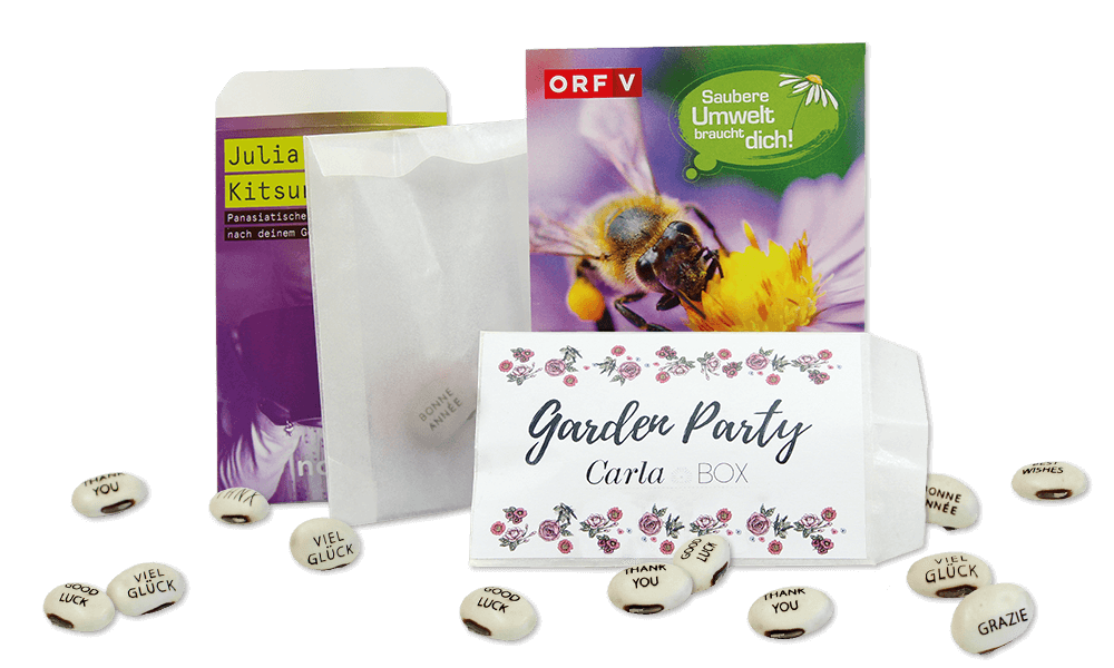 Wonder Beans verpackt in kleinen, individuellen Bohnentüten sind in drei verschiedenen Größen verfügbar. Die Lasergravur, als auch die Vorderseite der Bohnentüte können hierbei individuell gestaltet werden, durch die semitransparente Tütenrückseite schimmern die gelaserten Bohnen leicht durch. Außerdem besteht noch die Möglichkeit, ein individuelles Kärtchen mit in die Bohnentüte zu packen.